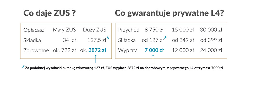 Możesz zabezpieczyć do 80% na działalności lub 65% pensji brutto, w razie zwolnienia  L4 z powodu wypadku, choroby lub innego zdarzenia które wyklucza Cię z pracy.